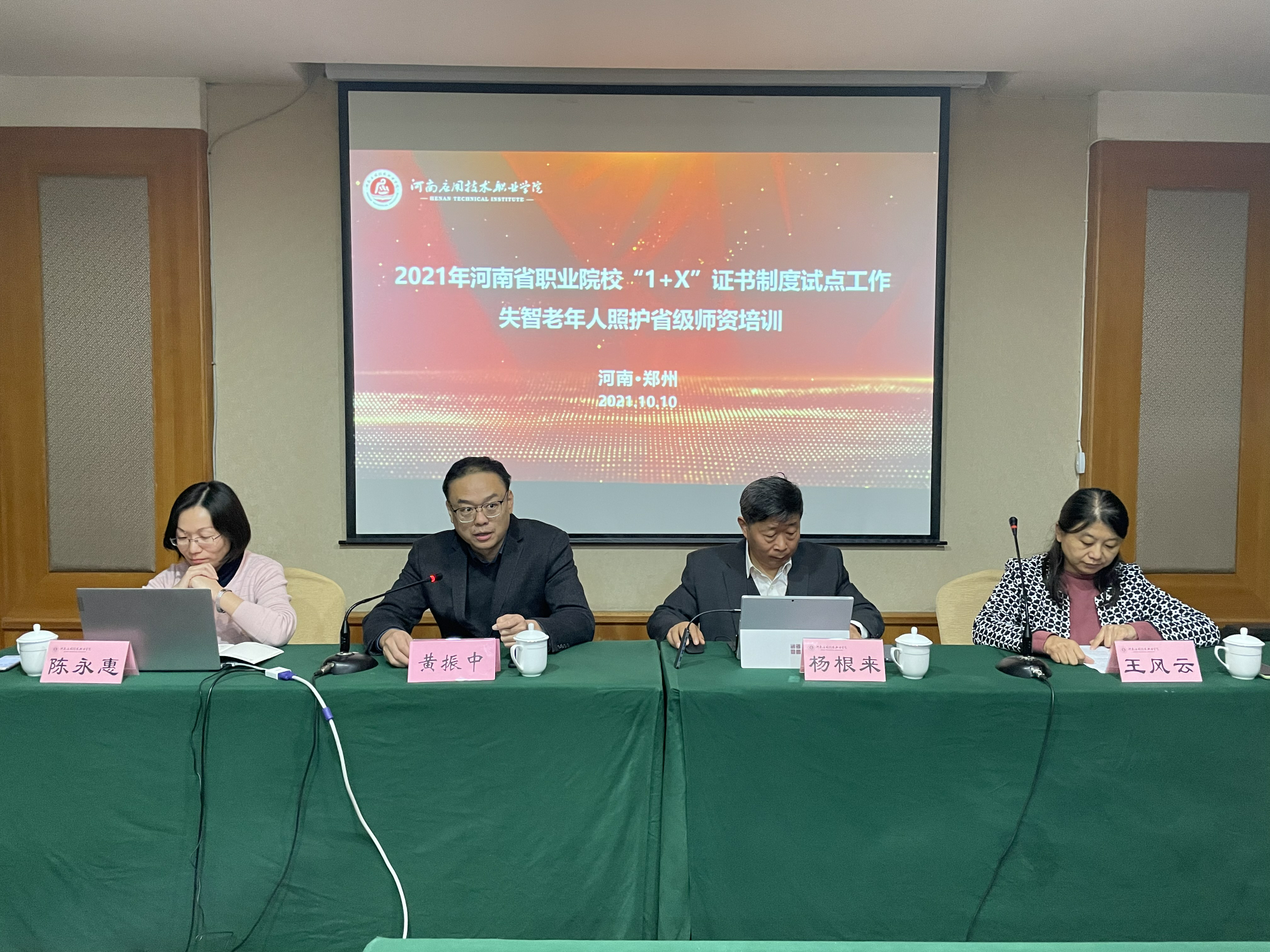 为贯彻落实《国家职业教育改革实施方案》精神,推进职业技能等级证书试点工作,2021年10月10日,2021年河南省职业院校“1+X”失智老年人照护省级师资培训班开班仪式在嵩阳饭店举行,北京中民福祉科技有限公司总经理杨根来、Beat365中文官方网站教务处处长黄振中、护理学院院长王风云、护理学院副院长陈永惠以及来自省内各高职院校的教师学员参加此次开班仪式。仪式由陈永惠主持。