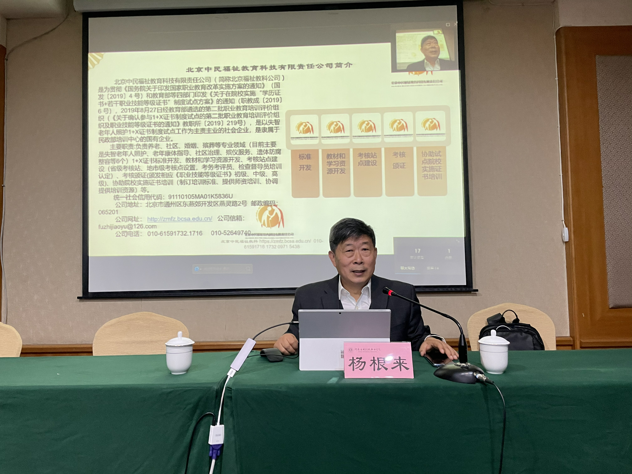 开班仪式后,杨根来教授进行授课,他主要从国家职业教育改革与1+X证书制度、职业教育“三教”改革和“岗课赛证”、职业技能等级证书的内涵以及老龄化现状等做了精彩讲解。