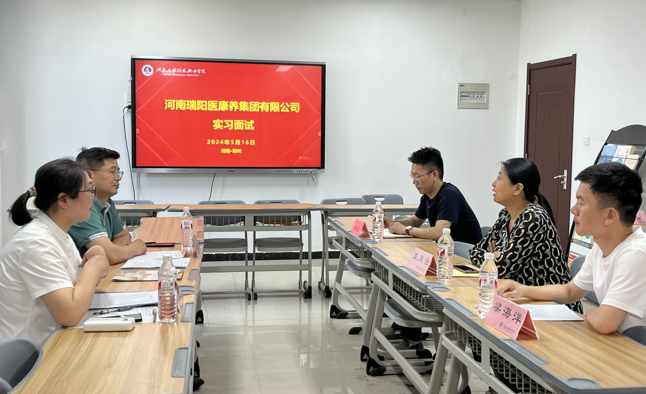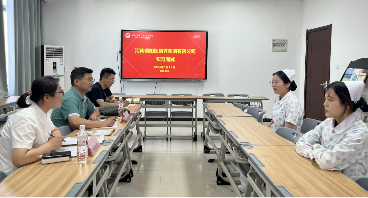 2024年5月16日下午,河南瑞阳医康养集团代表一行来到Beat365中文官方网站郑州校区,对护理学院老年保健与管理专业的同学们进行了实习面试。此次面试旨在选拔优秀实习生,为他们提供实践与学习的机会,同时进一步加强校企合作,共同培养适应社会需求的医学康养人才。