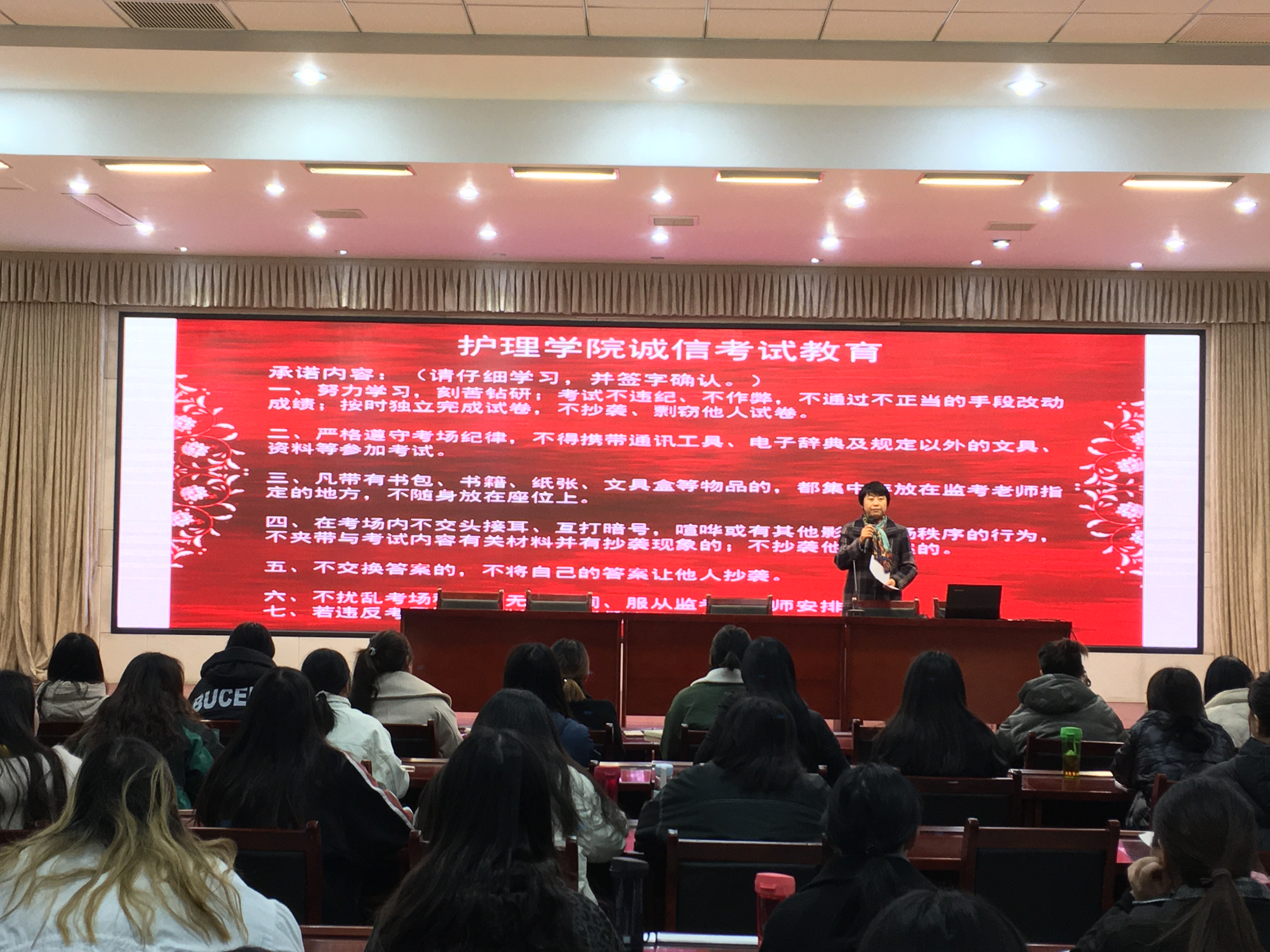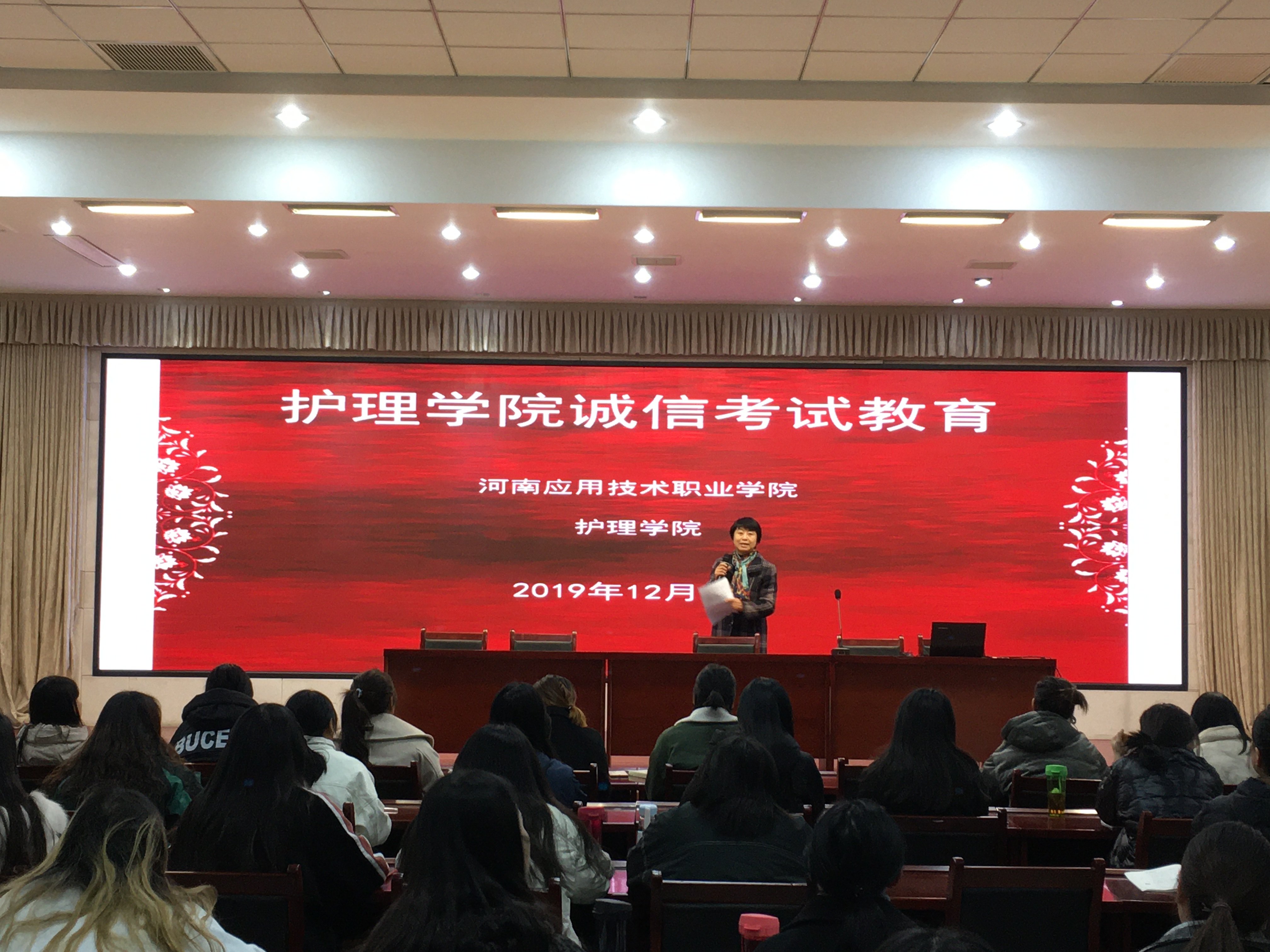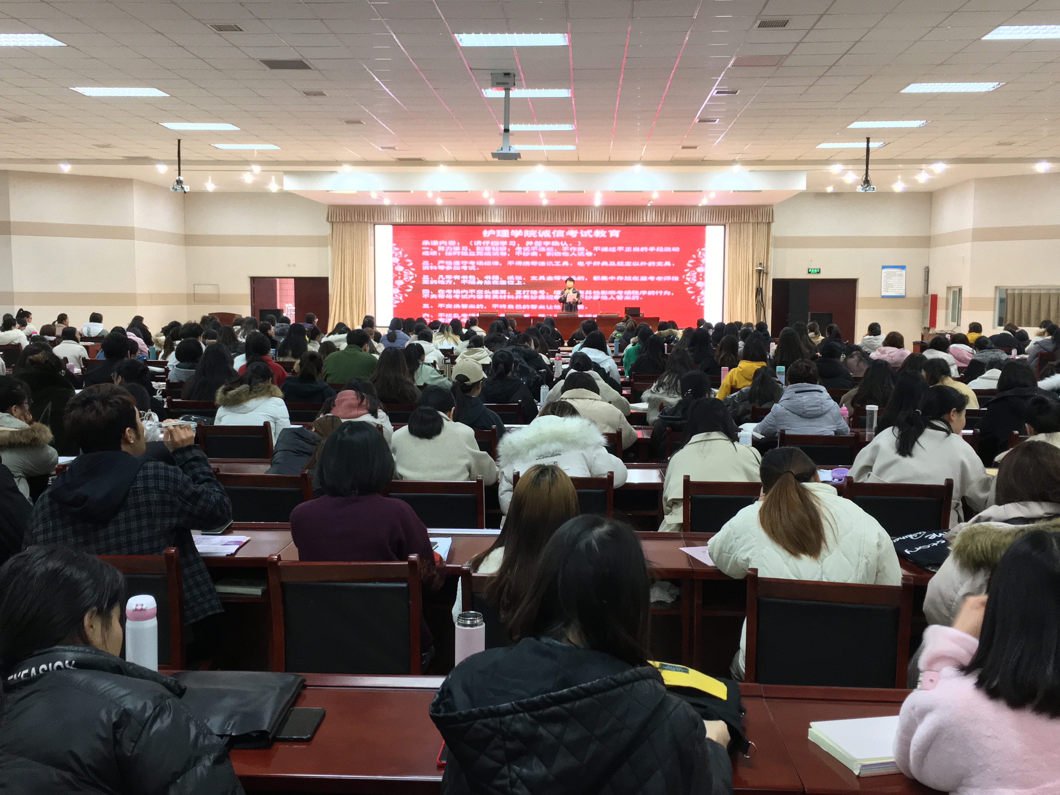 2019-2020学年第一学期期末,恰逢护理学院冲刺、备考教育部 “1+X”失智老年人照护等级证书考试之际,为了迎接即将到来的教育部“1+X”失智老年人照护等级证书考试和学期期末考试,加强学风考风建设,增强学生诚信意识,严肃考风考纪,营造公平、公正的考试环境,维护国家教育考试的权威性和公正性,杜绝违反考场纪律现象。2019年12月14日,护理学院在学校E楼二楼会议室,开展了诚信考试暨考风考纪宣传动员活动。护理学院17级、18级、19级各专业学生干部和部分学生代表共500余人参加了此次活动。学院领导和护理学院部分教师出席了本次活动。