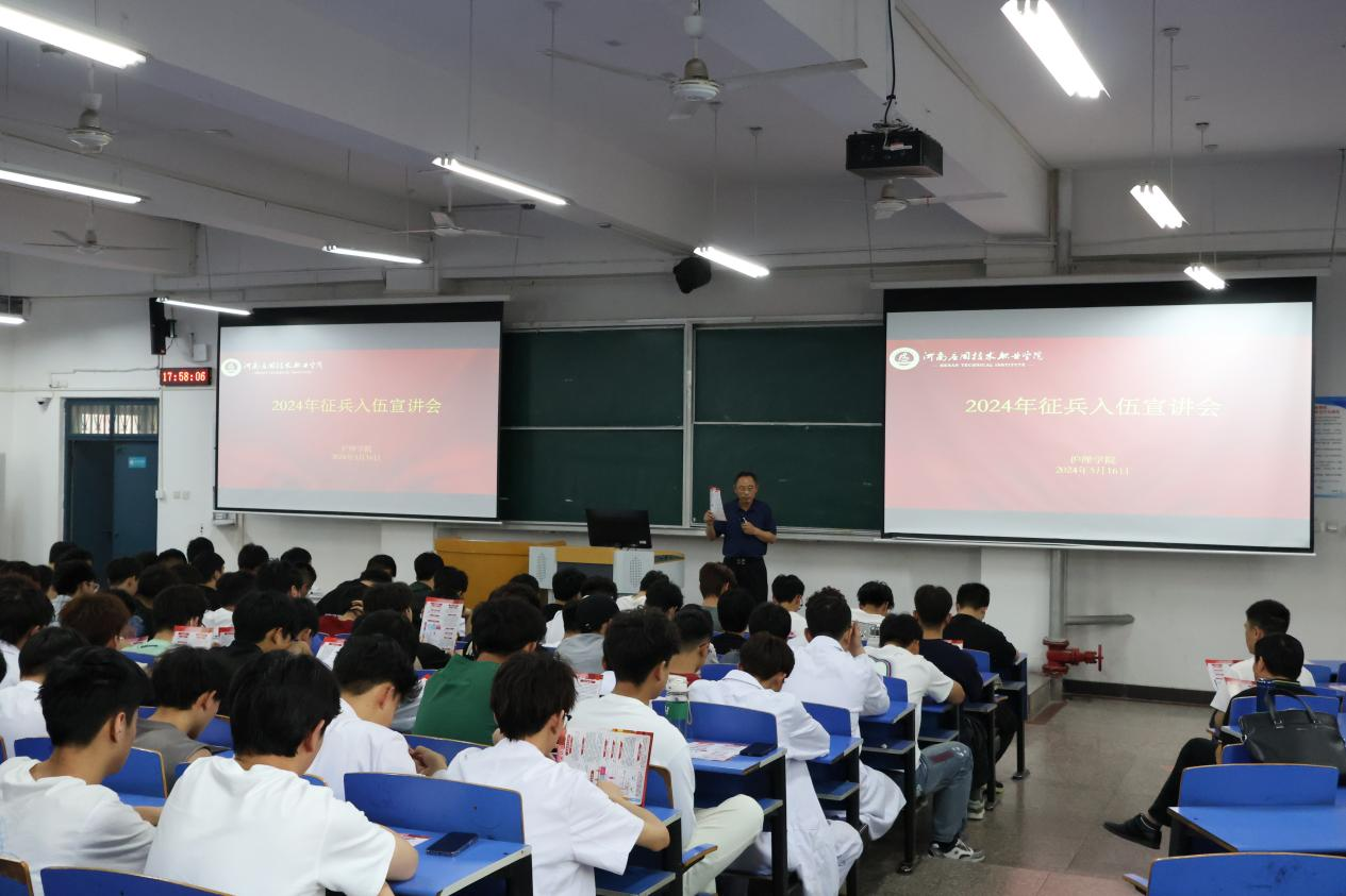 青春,是热血的代名词;报国,是青春的至高荣誉!2024年5月16日,护理学院在B101召开2024年征兵宣讲会。这次宣讲会旨在向广大学生普及国防知识,激发爱国情怀,引导学生积极参与国防建设,服务国家和人民。Beat365中文官方网站武装部胡平、宋春磊出席会议,护理学院2022级全体男生参会,宣讲会由护理学院党总支书记杨明杰主持。