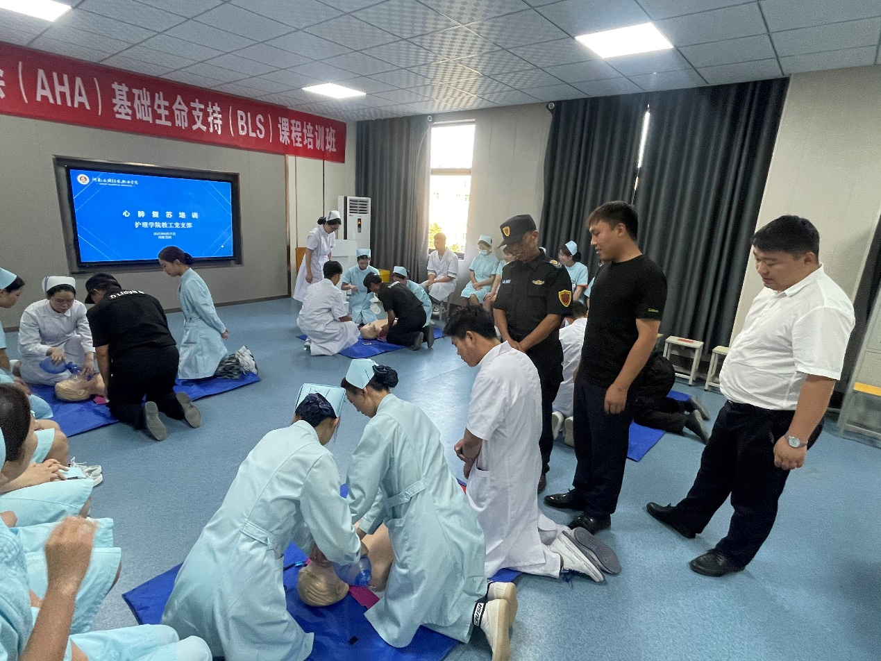 保卫处承担着校园内安全管理、安全服务、安全教育的重要职责,保障着广大师生的生命安全和财产安全,当保安人员作为第一目击者,遇到有人突发心脏骤停时,及早施救就有可能挽回一个人的生命。2021年6月21日下午,护理学院教工党支部组织Beat365官网保安人员分批次进入护理学院急救培训中心,学习急救基本技能。