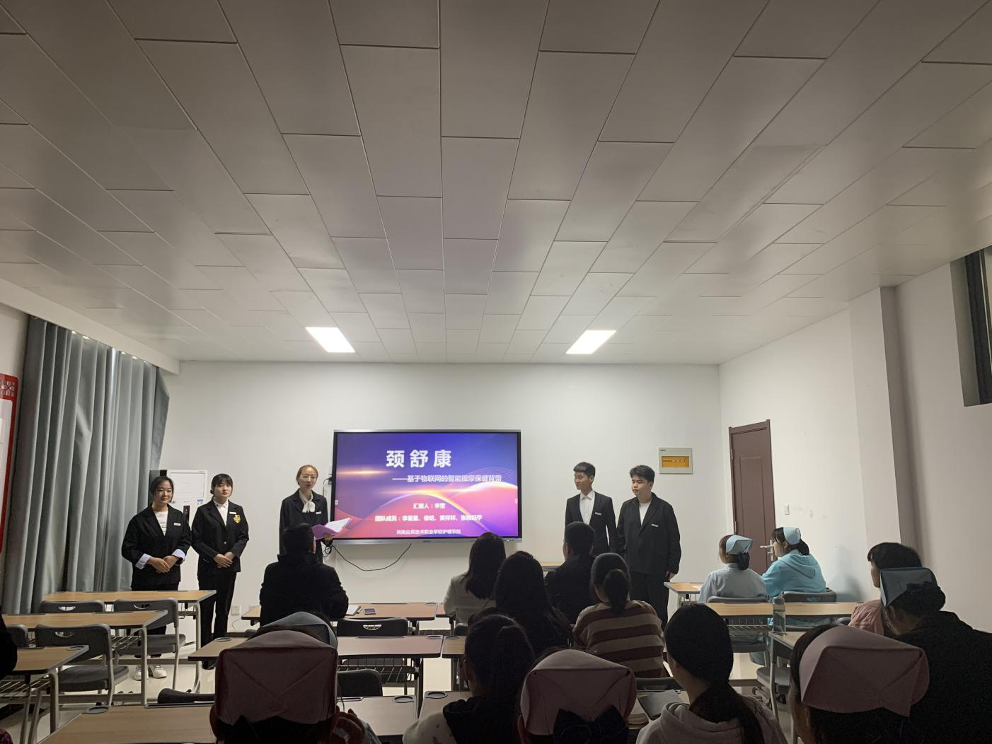 本次参加路演的六个团队分别是护理2015班《蚂蚁慢递》、护理1919班《21#拟鼠》、基础教研室《颈舒康》、护理1903班《舞钢市医养结合养老项目》、护理1907班《新型烟嘴盒》、护理2016班《滴滴看护》,这些项目都是屡破关卡,突破重围的佼佼者,他们整装待发、昂首迈步,期待着那破茧瞬间的绽放与蓄势华丽的转身。每一个宣讲人所展现出来的朝气与自信、执着追求梦想的毅力与战斗力都赢得了观众热烈持久的掌声,充分展现了新时代大学生独有的青春魅力与创新智慧。
