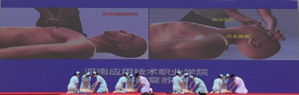 护理学院的心肺复苏职业技能表演代表学校参加职业教育活动的舞台展演活动。在李红老师的精心指导及学生们的刻苦训练下,12名同学在激昂的音乐中展示了在心搏骤停之后黄金四分钟内的紧急救援措施——心肺复苏。舞台上,每三名同学组成救援团队分工协作,胸外心脏按压、呼吸气囊吹气、体外自动除颤有条不紊的进行,直至患者复苏成功,使现场观众切身感受到了心肺复苏的实用性和重要性。学生们有序的分工合作和整齐划一的专业动作,赢得了全场观众的热烈掌声。