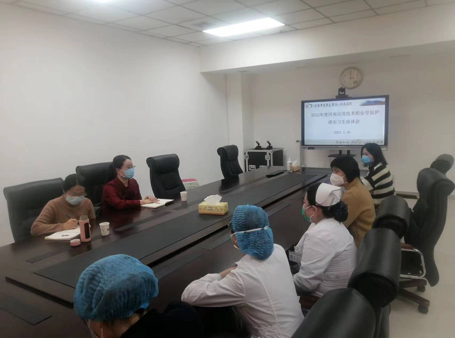 2023年2月27日下午,实习指导教师温晓丽、刘常鹏老师到河南中医药大学第三附属医院检查走访我院岗位实习学生,中医药大学第三附属医院护理部主任张晓黎和实习负责人马明睿组织召开了实习生座谈会。