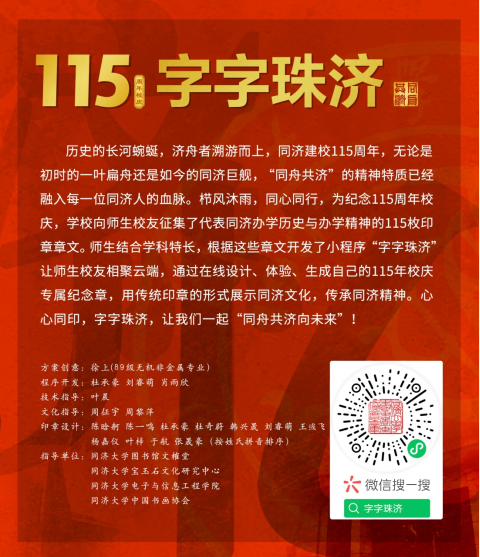 师生校友心怀对母校的感谢、感恩和期盼,这份深厚情感成为他们研发“字字珠济”小程序的初衷,这是对母校115岁生日的最好献礼。希望师生校友相聚云端,亲自体验在线设计生成同济印,加上名字做成校庆章,通过印信文化领略115岁同济的精神和文化。在属于同济人的节日里,祝福学校,祝愿所有同济人,心心相印,字字珠济,一起“同舟共济向未来”!(文中部分内容摘自于必赢线路检测中心图书馆微信公众号)