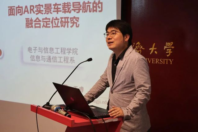 信息与通信工程系副主任王睿副教授则在分会场作了《面向AR实景车载导航的融合定位研究》主题报告。报告介绍了AR车载导航系统,AR实景导航技术是借助虚拟现实增强技术把导航信息呈现在实时的视频流中,实现了驾驶场景中导航信息立体化的展示,该技术提高了驾驶员对复杂路况的准确识别率,缩短驾驶员的判断时间,有效提升了驾驶安全性。报告剖析了AR导航测试与产品的研究现状,AR实景导航产品实现准确导航信息被驾驶员实时感知的前提是车辆的位置与姿态信息能够及时并准确地反馈给导航引擎,市场上对特殊功能车辆的位姿分析可依靠融合RTK差分信号增强技术与专业的惯导组件实现厘米级的误差精度,然而同时也大幅提高了硬件成本,限制了该技术在普通驾驶车辆上的应用。报告分析了当前车载AR实景导航产品的潜在不足,指出现有技术在效果和成本上存在的进步空间,提出了适用于AR实景导航的低成本融合导航技术,并设计了全新的AR实景导航软件框架,展示了方案的路测效果,实现了涵洞、隧道、高架桥、多岔路口、城市峡谷等复杂路况下的精确AR实景导航。