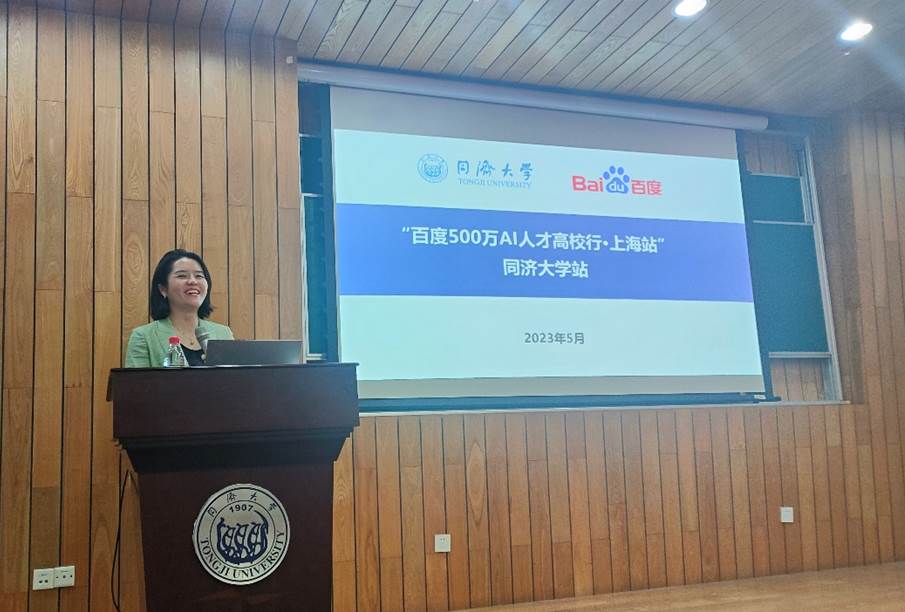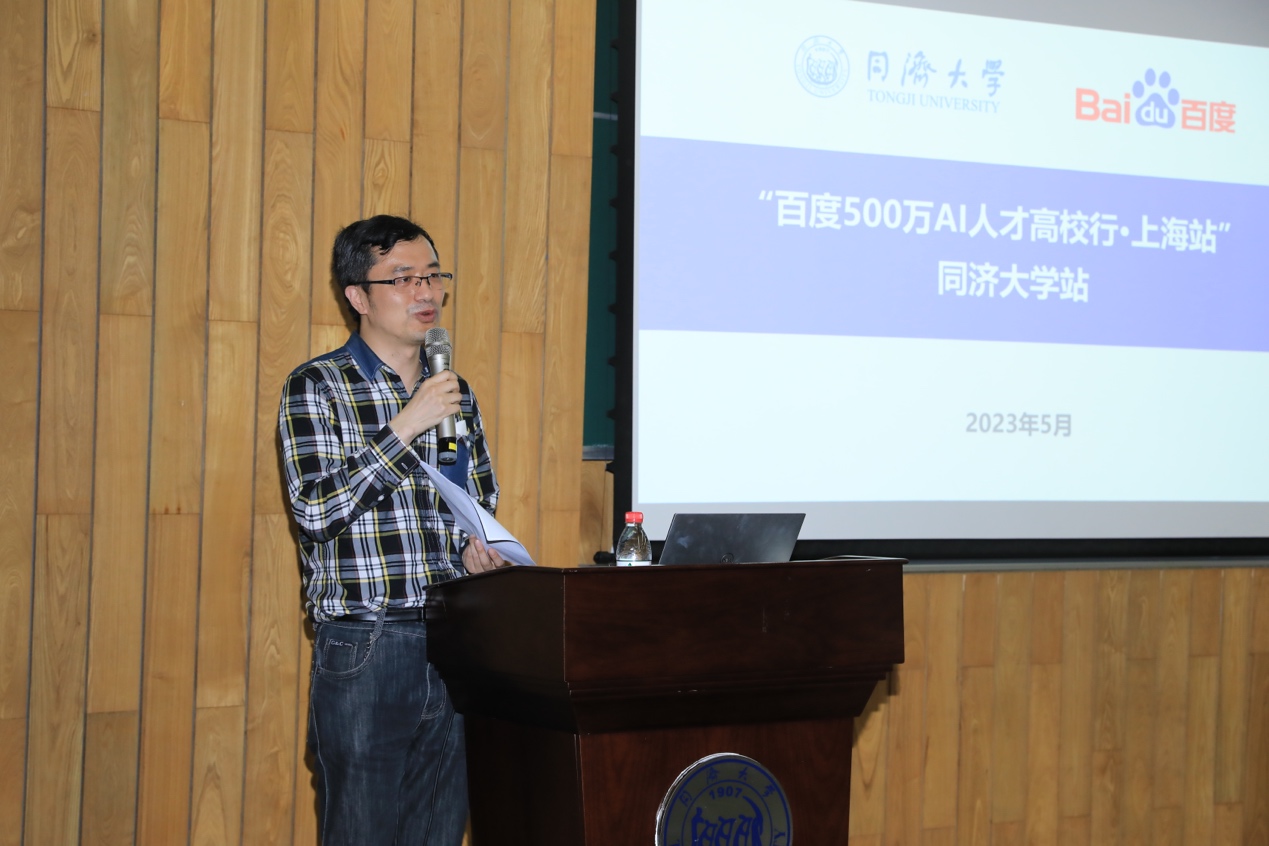 百度高校合作部周方棣经理作为活动主持人,同时也是百度方致辞代表,回顾了百度与同济的校企合作,讲述了百度“500万AI人才”培养计划。计划从2020年启动至今,已经完成了300万AI人才培养,形成了企业CTO/架构师、教师与学生、广大开发者的金字塔式的人才培养体系。“高校行”系列活动旨在为同学们带来更多的人工智能产业视角。