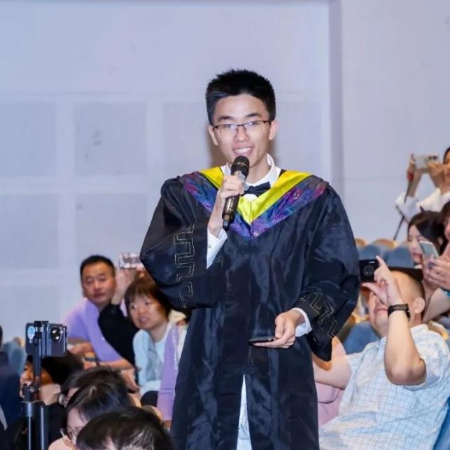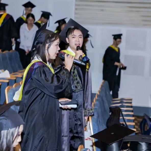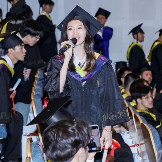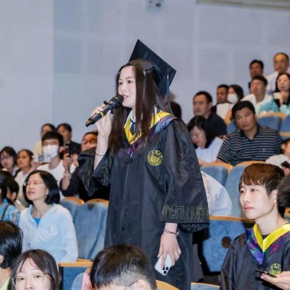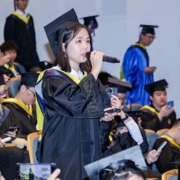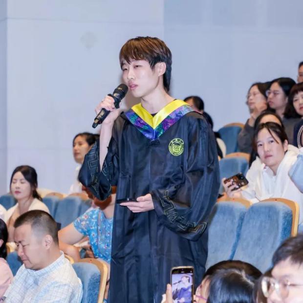 “每一种生命都有自己的生长方式。玫瑰不必长成松柏,每个人也无需沿着同一条轨道前行。在无数个成长的瞬间,我们更应该保持自我,坚持本心。”电子科学与技术专业研究生代表谢好同学生动地回顾了在智信馆度过的三年充实、温暖而充满挑战的时光。她代表所有研究生祝福到:“愿他日风起时再相逢,花开时再重聚!祝福母校事业蒸蒸日上,祝福全体老师桃李芬芳,祝福同窗前程似锦,祝福家长幸福安康!”