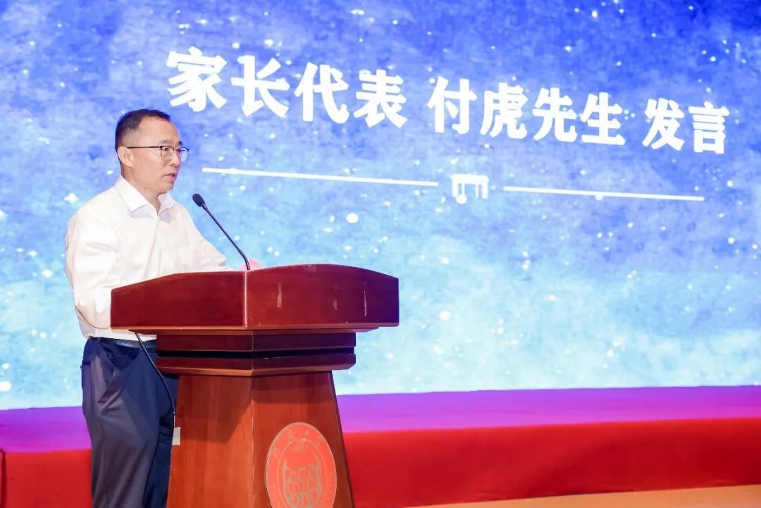 本科毕业生付舒阳的父亲付虎先生作为家长代表发言。他代表全体家长向顺利完成学业的同学们表示热烈的祝贺,向为孩子们成长倾注心血的老师们表示衷心感谢,感恩同济四年的精心培育,让青涩少年蜕变为“眼中有光、意气风发的追梦者”。最后,付虎先生引用敦煌文献《太公家教》的一句箴言寄语在场所有毕业生:“明珠不营,焉放其光;人生不学,言不成章”。
