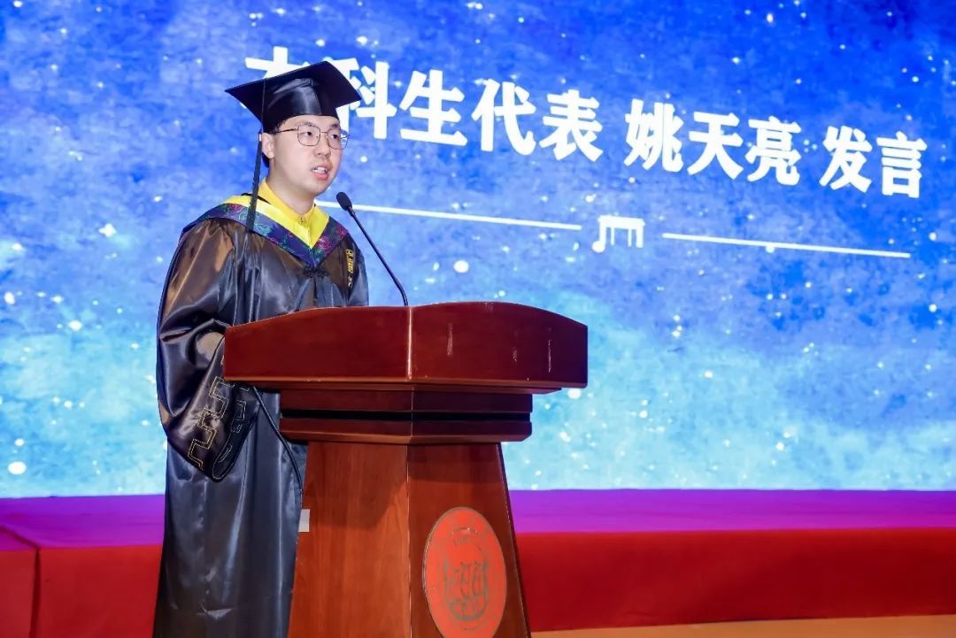 自动化专业本科生代表姚天亮在发言中表示,于他而言,大学四年是同济精神滋养的四年,是知识转化为实践能力的四年。他代表全体本科毕业生庄严承诺:未来将带着同济赋予的智慧与力量、责任与担当,努力成为国家科技自立自强征程中的奋进者、开拓者,用实干与创新书写新时代同济电信人的璀璨荣光!