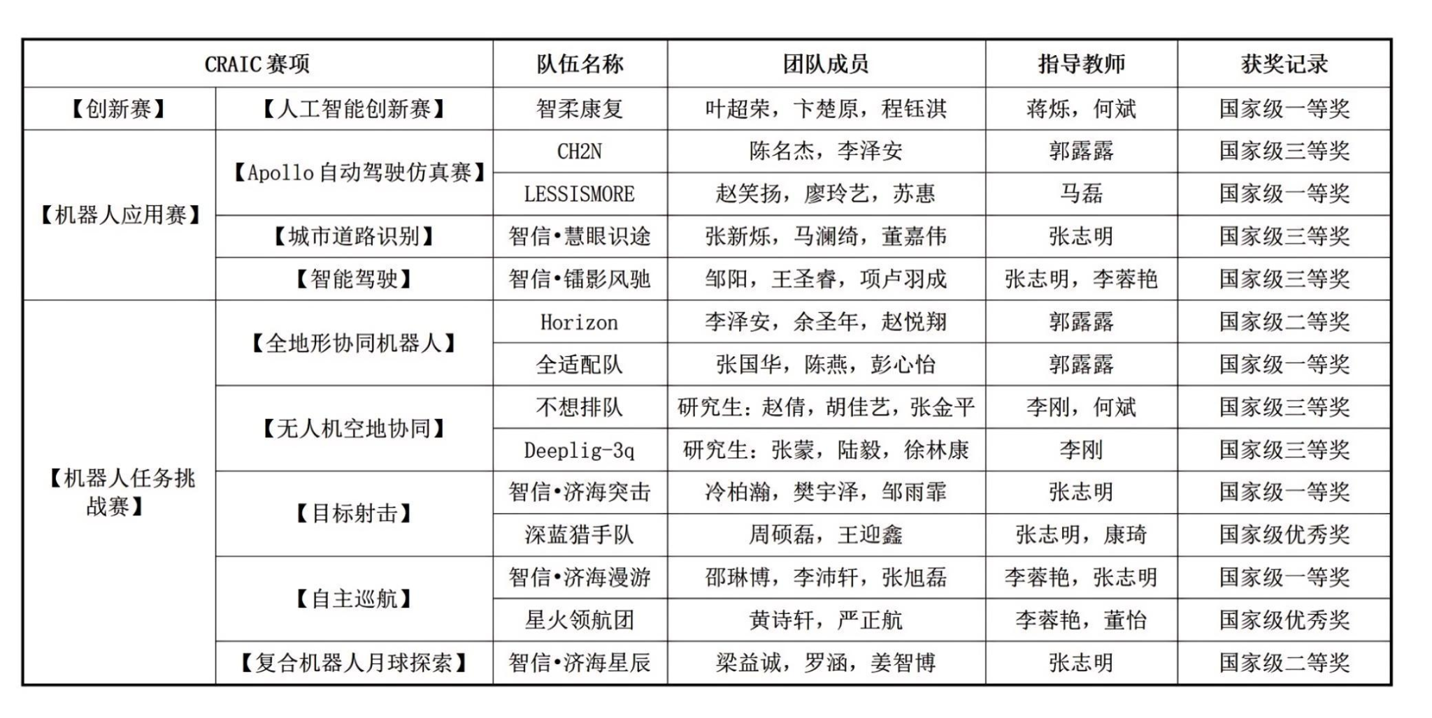 获奖队伍名单