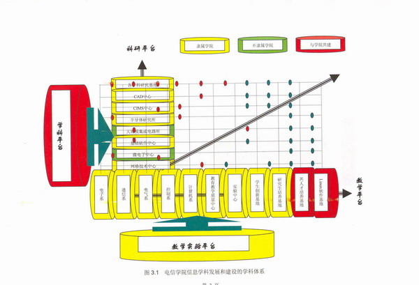 其中学科体系由科研平台和教学平台共同构成。科研平台由各学科科研基地、CAD研究中心、CIMS研究中心、半导体研究所、大规模集成电路研究所、基础软件中心、微电子中心、国家高性能分中心等研究基地和研究中心组成;教学平台则包含电子系、通信系、电气系、控制系、计算机系五个系以及院实验中心、教育教学研究中心、大学生创新基地、研究生培养基地、IC人才培养基地等与教学紧密相连的中心和基地组成。科研与教学两大平台的各元素在多方面结合形成强大的学科竞争力。