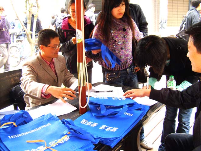 在深入开展学习实践科学发展观活动中,电信学院控制电子联合党总支博士生支部,于4月14日在嘉定校区步行街路口举办了“爱生活 爱环保”大型重视环保,节约资源为主题的宣传活动,受到了同学们的欢迎和认可。