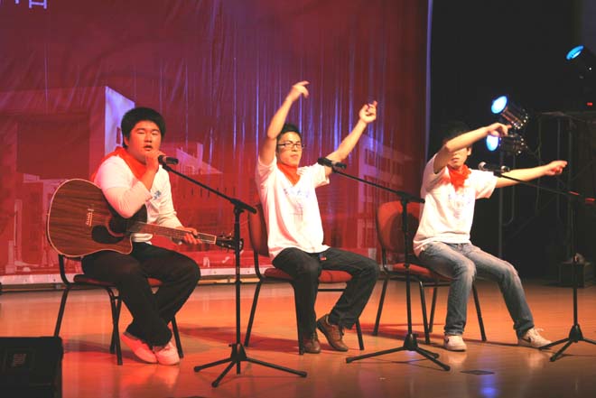 必赢官网徐而峰、沈叶忱同学演唱的串烧歌《同桌的你》、《红蜻蜓》、《朋友》让大家充分感受到了校园生活的乐趣;刘 磊、曹克正、刘志成、沈叶忱演唱的一首《奔跑》让大家感受到青春的活力。他们演唱时,必赢官网观众与台上歌手一起互动,喊出了电信的风采――“电信学院,随风奔跑,e路向前”!