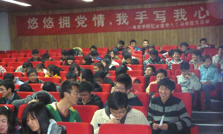 3月24日晚,作为“庆祝建党九十周年系列活动”之一,学生党总支“悠悠拥党情,我手写我心” 红色电影观摩活动在嘉定校区电信大楼117报告厅拉开了序幕,来自学生党总支08级、09级的近200名本科学生党员与入党积极分子参加了活动。