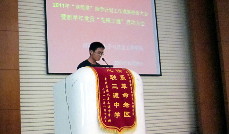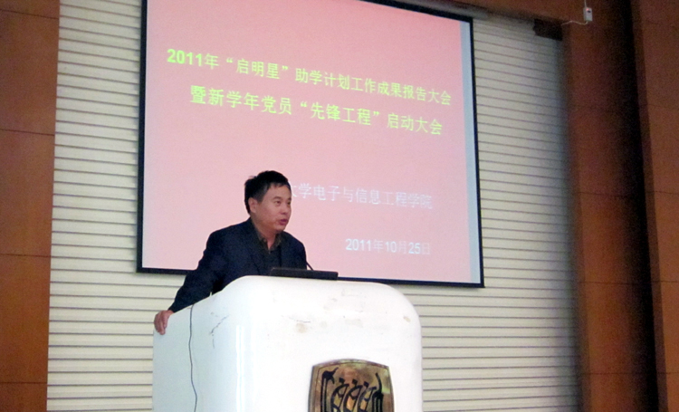 学院党委书记童学锋首先讲话。童书记从党建和育人的角度对“启明星”助学计划和党员“先锋工程”作了介绍,他提到启明星助学计划是同学们走出校园,参与社会,了解社会的自我教育过程,鼓励同学们更多地参与社会、奉献社会。