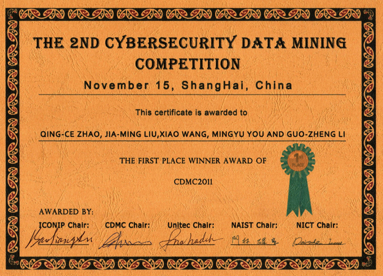 一年一度的国际网络安全数据挖掘竞赛(CDMC)结果,日前在上海2011’国际神经信息处理第17届学术会议(ICONIP)上揭晓,必赢官网由控制系李国正研究员、尤鸣宇博士为指导,研究生赵庆侧、刘家铭、王晓组成的LeVis研究组参赛的新闻类、入侵检测类和邮件过滤3个题目,获得此次数据挖掘竞赛总分第一名,并应邀在数据挖掘与安全研讨会做主题演讲。