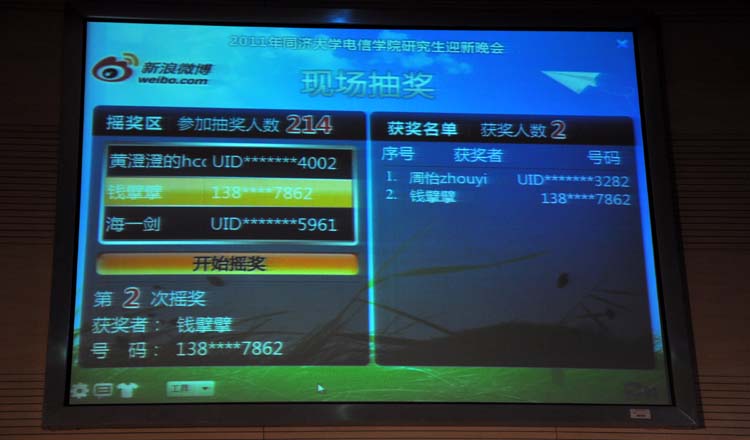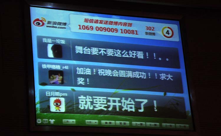 本次晚会还开通了微博,并进行现场直播。整个晚会期间,收到了1200多条来自微博的互动,同学们纷纷通过微博表示:“晚会太给力了”;“电信学院好有爱”;“葫芦丝空灵,孔雀舞惊艳啊”……。