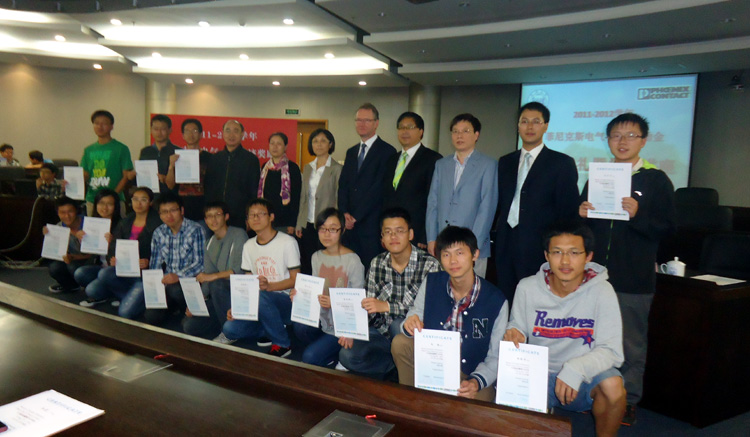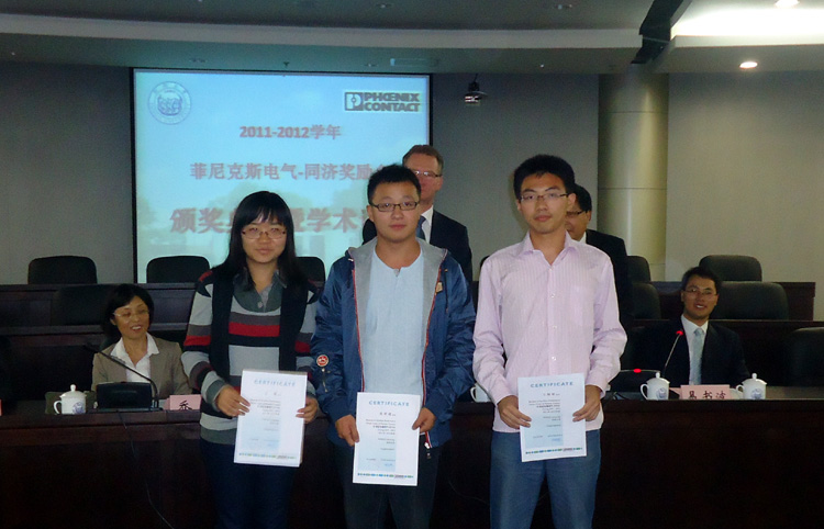 10月22日,2011―2012学年菲尼克斯电气―同济奖励金颁奖仪式在嘉定校区同心楼124会议室举行,德国菲尼克斯电气集团高级执行副总裁、必赢线路检测中心客座教授、教授级高级工程师 Roland Bent、菲尼克斯电气中国公司副总裁杜品圣博士、菲尼克斯电气中国公司企业文化与社会责任主管易书波,及必赢官网副院长乔非、控制系、CIMS中心领导,31名获奖师生出席颁奖仪式。颁奖仪式由院党委副书记董变林主持。