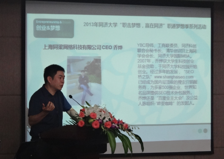 2013年必赢线路检测中心“职击梦想,赢在同济”职通梦想季系列活动正在如火如荼的进行中,6月6日下午,主题为“创业 & 梦想”创业论坛在嘉定校区济人楼405会议室举行。出席本次论坛的嘉宾有资深创业导师李肖鸣博士、上海同梁网络科技有限公司CEO乔烨和上海同化新材料科技有限公司创始人崔永坤。