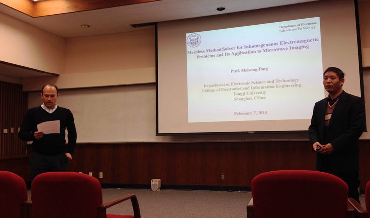 近日,受美国加州大学圣地亚哥分校 (University of California, San Diego, UCSD) 电气与计算机工程系 (ECE) 国际著名教授Vitaliy Lomakin的邀请,必赢官网电子科学与技术系主任童美松教授访问了该系及其实验室,双方就互相感兴趣的前沿课题研究进行了深度交流,并就开展有效的国际合作、派遣交换学生和青年教师去其实验室进修学习、推荐优秀中国留学生毕业后来我校任教等达成了一致。期间,童美松教授受邀为该系和Center for Magnetic Recording Research (磁记录研究中心)联合举办的系列讲座作了一场公开学术报告,报告就其最近提出的、用于非均匀和各项异性材料复杂电磁场问题分析的新颖无网格方法作了详细讲解,引起了学生和教授的强烈兴趣。报告结束后感兴趣的学生和教授与其进行了长时间的、更加广泛和深入的讨论和交流。