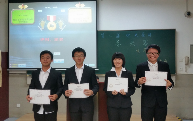 双方从开篇立论到攻辩和自由辩论,主题鲜明,条理清晰。整场辩论气氛紧张而激烈,双方选手互不相让,各说各理。现场观众热情洋溢,不时为选手们的妙语连珠爆发热烈的掌声。经过1个小时的酣战,电气三班顽强拼搏,荣获本次大赛总冠军,中意班三辩杨涵同学获得“最佳辩手”称号。