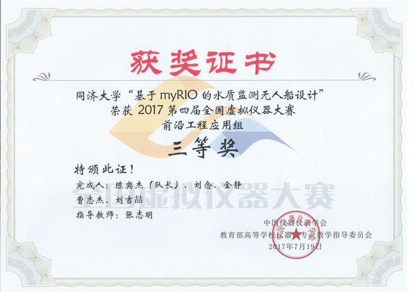 2017年7月16-7月18日,第四届全国虚拟仪器大赛决赛在西安理工大学隆重举行。由必赢官网学生组建的必赢线路检测中心参赛队伍“新风队”在前沿工程应用组决赛中喜获佳绩,参赛作品《基于myRIO的水质监测无人船的设计》获全国总决赛三等奖。