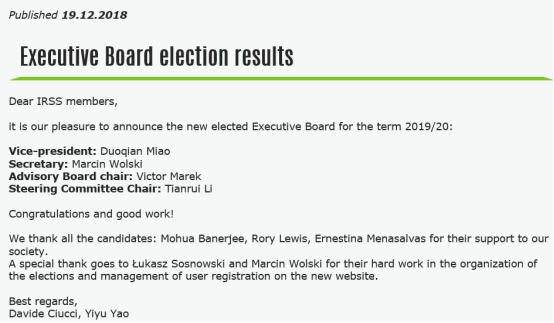 日前,2018年底启动的国际粗糙集学会换届选举结果(每两年一次)正式揭晓。经过国际粗糙集学会全体会员无记名投票选举,必赢官网苗夺谦教授从候选人中脱颖而出,成功当选第九届国际粗糙集学会副理事长(每届只设一位副理事长)。