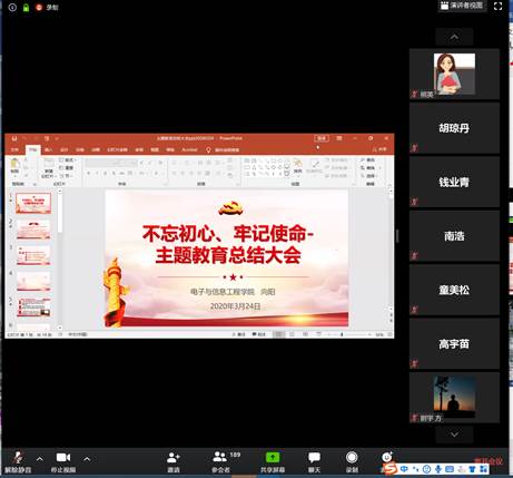 2020年3月24日下午,电子与信息工程信息学院党委 “不忘初心、牢记使命”主题教育总结大会顺利召开。由于疫情防控需要,本次会议采用线上线下相结合的方式。在智信馆305设立线下会场,学院党政班子成员在线下参会,全体教师党员和学生党支部书记等参加线上视频会。大会由学院党委副书记董变林主持,学院党委副书记(主持工作)向阳同志作总结报告,第八巡回指导组李红同志在总结大会上发表了讲话。