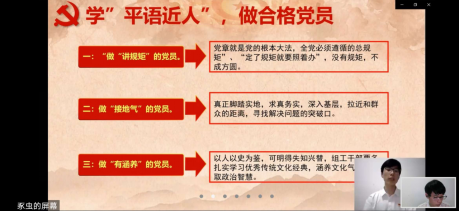 3月24日,支部举办了第一次线上读书分享会。本次分享会通过线上“微党课”的形式开展,由第一读书小组进行分享。组长杨春奇同学及其小组成员分析了平语近人的四个原因:接地气、重民生、得民心、具有正能量,并着重对习近平总书记的三处用典进行讲解:“我们是人民的勤务员”;“政之所兴在顺民心,政之所废在逆民心”;“政策好不好,要看群众是哭还是笑”。通过对总书记用典的解读,带领党员、团员和群众感受总书记“心里真正装着群众,帮群众解决实际困难,时刻相信且依靠群众”的爱民情怀,激励支部成员要做“讲规矩”、“接地气”、“有涵养”的合格党员。在读书之余,第一小组的成员们注重思考,联系抗疫实际,总结了千万共产党员和人民群众在抗击疫情中的感人事迹,“哪里最困难,哪里最危险,哪里就有共产党员”,党员要发挥战疫的排头兵的作用。