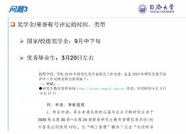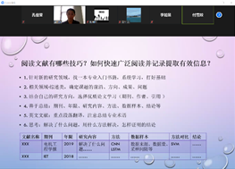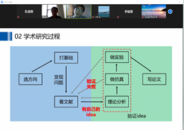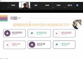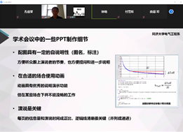 在经验分享环节,钱城晖通过关系图简洁地展示了学术研究的几个过程阶段,着重分享阅读文献的技巧,例如:泛读和精读相结合、比较阅读和分类管理以及从实验挖掘思路等等方法,实用有效。付雪姣则以拼图为比喻,强调打好基础的重要性,指出科研工作要有整体观念和框架概念,对于答辩过程中的注意事项也进行了细致的归纳总结。陈桐杰提出夯实基础是非常重要的,同时也要注重从实验中总结经验。钟响对于学术会议PPT的演讲和制作过程中的注意事项进行深入剖析,提到了有关配图的图名、标注和动画播放效果等细节。李如昱针对疫情期间的特殊情况,提出了“云”科研的7条小建议:独立的空间、时间的规划、便利贴督促、用好VPN、合理的目标、分明的奖惩以及积极的沟通。黄帅则对有关奖学金及荣誉称号评定等事宜进行分享,为同学们答疑解惑。