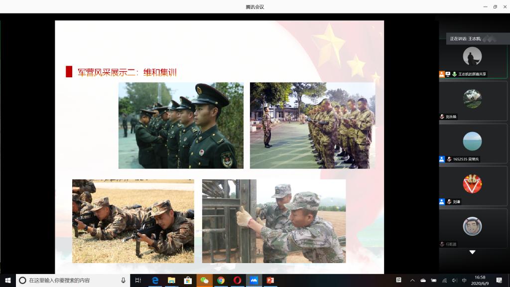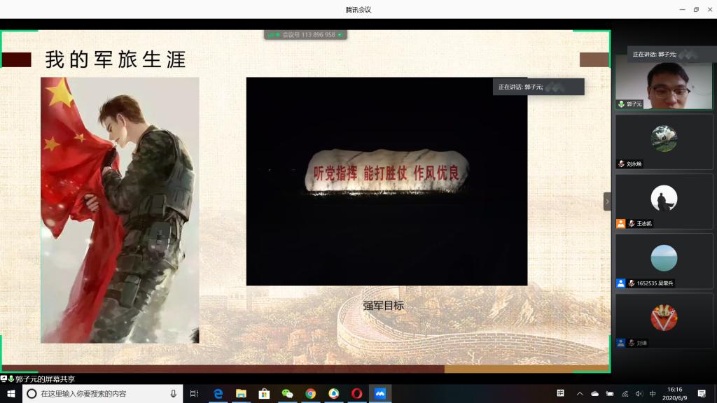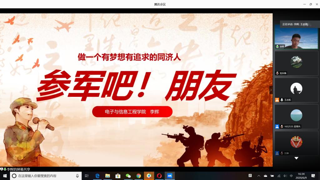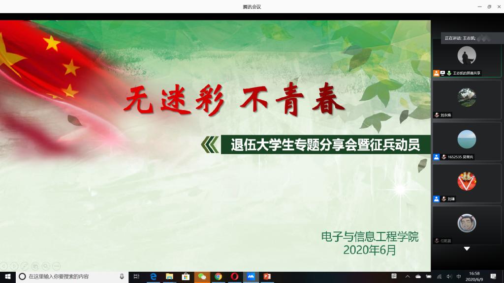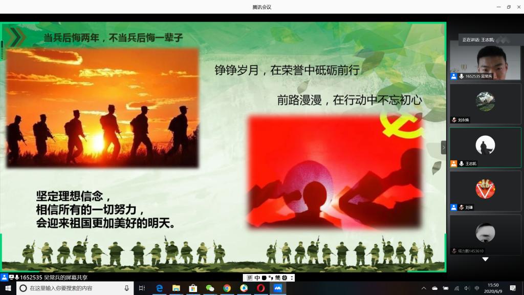 “国无防不立,民无兵不安”,巩固国防和强大军队是新时代坚持和发展中国特色社会主义、实现中华民族伟大复兴的战略支撑。6月9日下午,必赢官网成功举办以“无迷彩,不青春”为主题的线上退伍大学生分享暨2020年征兵动员会,会议由必赢官网退伍大学生王志凯主持,学生党总支副书记刘永焕、学工办主任刘谦、辅导员汤若琦、王秋晨和常恒以及有意向应征入伍的大学生参加了分享动员会。分享会上,来自四个学院的八名优秀退伍大学生从国防的意义及我国部队的发展与改革展开,结合自己的亲身经历,向参会的大学生分享了自己难忘的军旅生涯和参军故事,号召更多的有志青年,以强烈的政治意识和使命担当,携笔从戎,以实际行动积极支持和服务改革强军战略。