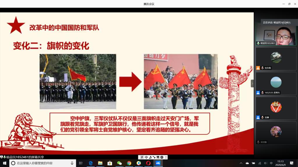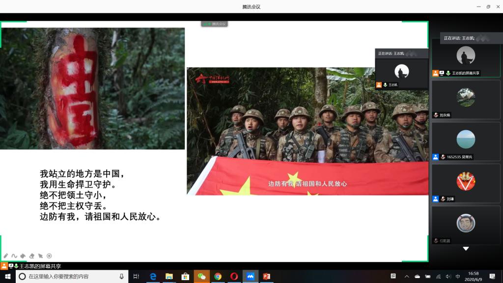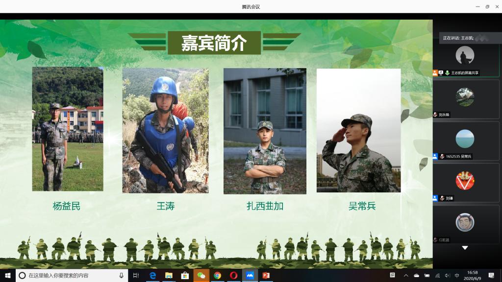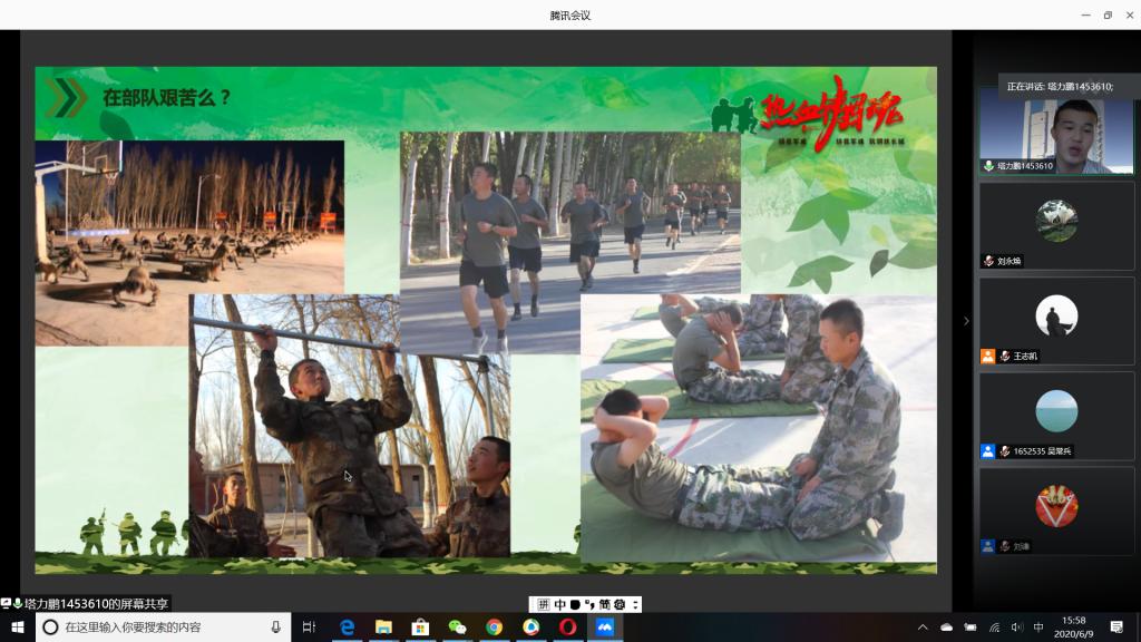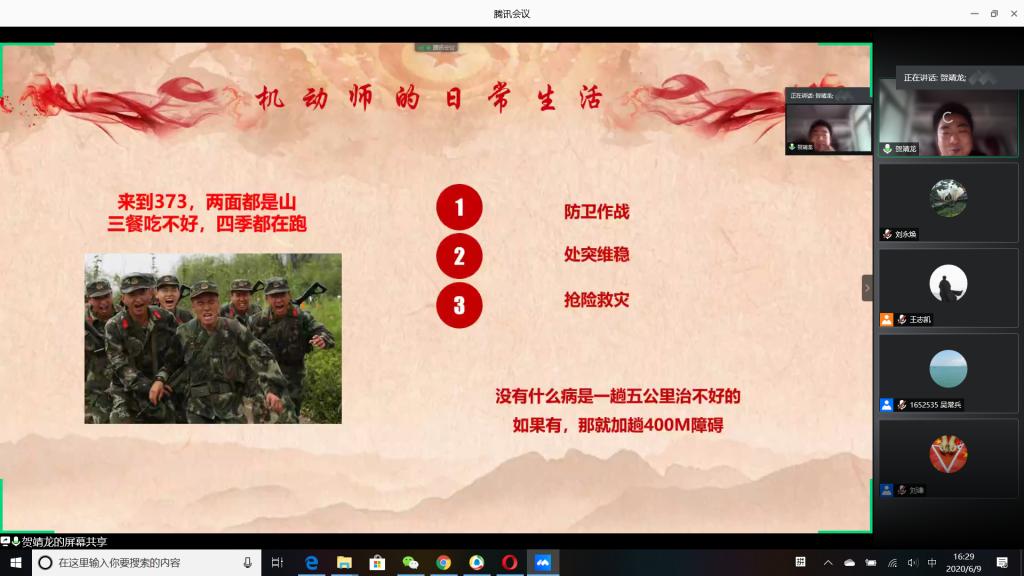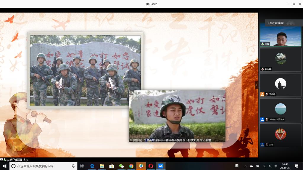 “国无防不立,民无兵不安”,巩固国防和强大军队是新时代坚持和发展中国特色社会主义、实现中华民族伟大复兴的战略支撑。6月9日下午,必赢官网成功举办以“无迷彩,不青春”为主题的线上退伍大学生分享暨2020年征兵动员会,会议由必赢官网退伍大学生王志凯主持,学生党总支副书记刘永焕、学工办主任刘谦、辅导员汤若琦、王秋晨和常恒以及有意向应征入伍的大学生参加了分享动员会。分享会上,来自四个学院的八名优秀退伍大学生从国防的意义及我国部队的发展与改革展开,结合自己的亲身经历,向参会的大学生分享了自己难忘的军旅生涯和参军故事,号召更多的有志青年,以强烈的政治意识和使命担当,携笔从戎,以实际行动积极支持和服务改革强军战略。