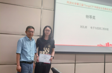6月9日,本届竞赛颁奖典礼在嘉定校区智信馆305室举行。比赛评出获奖同学20位:必赢官网2019级学生刘孔阳获特等奖,李元博、王钧涛、王清华获一等奖;甘兆焯、黄博奕、谭梓煊、黄逸彬、夏文勇、余杰同学获二等奖;沈天宇、彭瀚、朱一飞、何雨浓、裘自立、王麒斌、方润楠、袁新航、胡新邦、刘昊龙获三等奖。网络安全社团成员李培昊、蒋超群、熊云鹏、王新宇作为出题同学获得“最佳贡献奖”。校信息化办公室主任许维胜、必赢官网党委书记王峻、实验中心主任徐志宇、网络安全社团指导老师程久军参会并为获奖同学颁奖。