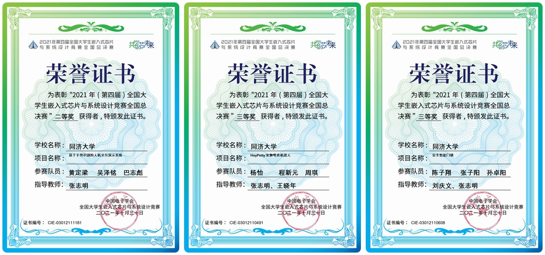 本次大赛采用组委会指定方向、参赛队自主选题的模式,在组委会指定的嵌入式集成芯片或开发平台上,由参赛队自主选择项目、设计参赛内容、搭建应用系统,完成参赛作品。由必赢官网控制系教师张志明指导,自动化专业的黄定梁、吴泽铭、巴志彪组成的“两片面包夹芝士”队获应用赛道ST赛题全国二等奖1项;计算机系刘庆文、控制系张志明指导,信息安全专业的陈子翔、张子阳、孙卓阳同学组成的“CPU写的都队”队、控制系张志明、王晓年指导,杨怡(自动化)、程新元(计算机科学与技术)、周琪(电子信息)组成的“百事可乐”队获得应用赛道海思赛题全国三等奖2项。同时,这3支队伍9名队员已在先期举办的东部赛区比赛中获得一等奖。除此之外,东部赛区另有2支队伍6名队员获得二等奖,6支队伍18名队员获得三等奖。