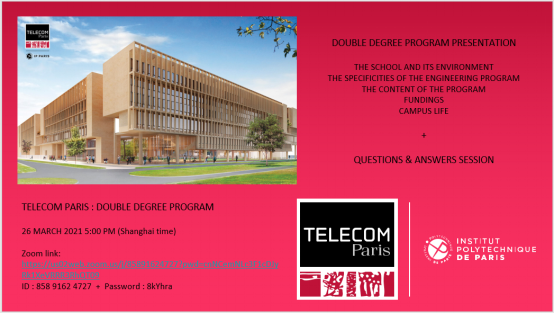 巴黎高科-国立巴黎高等电信学校是我校战略合作伙伴——法国巴黎高科集团的成员学校。2018年,我校437必赢会员中心于与巴黎高科-国立巴黎高等电信学校签署了双文凭合作协议。为了进一步帮助我校相关学生了解国立巴黎高等电信学校的双文凭项目,该校国际项目负责人Nicolas PROST先生将于2021年3月26日举行线上宣讲会,欢迎同学们踊跃参加。