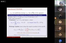 雷金龙研究员分别从多智能体决策的背景、模型、势博弈的异步算法以及变尺度采样的分布式算法等方面展开报告。报告中,雷金龙研究员首先介绍了多智能体决策的背景和常见的决策优化模型及其对应的案例。介绍了纳什均衡的相关概念和基本假设及变分不等式问题与纳什均衡问题之间的等价关系。接着详细介绍了同步梯度响应、最佳响应算法、近似最佳响应算法,设计了针对随机变分不等式问题的求解算法。然后对于不确定信息下多智能体的纳什均衡问题,利用势博弈的方法提出异步近似最佳响应方案进行求解,在证明算法渐近收敛性的同时将算法拓展到加权势博弈情况。最后针对智能体仅能获取非完美局部反馈信息,介绍基于变尺度采样和采样梯度估计的分布式算法并给出仿真验证和性能分析。雷金龙研究员丰富精彩的报告为学校师生的学习和科研工作带去了思想启发,也为同学们学习多智能体决策优化与博弈提供了有益指导。