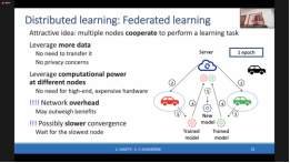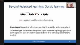 Carla Fabiana Chiasserini教授接着向大家介绍智能互联车辆。首先对比了现代车辆和自主车辆在数据量上的差异。然后介绍基于人工智能或机器学习的互联车辆的应用,例如轨迹预测、自适应巡航控制等。而后详细介绍了分布式学习的联邦学习以及联邦学习的八卦学习,并分析其优势与劣势。