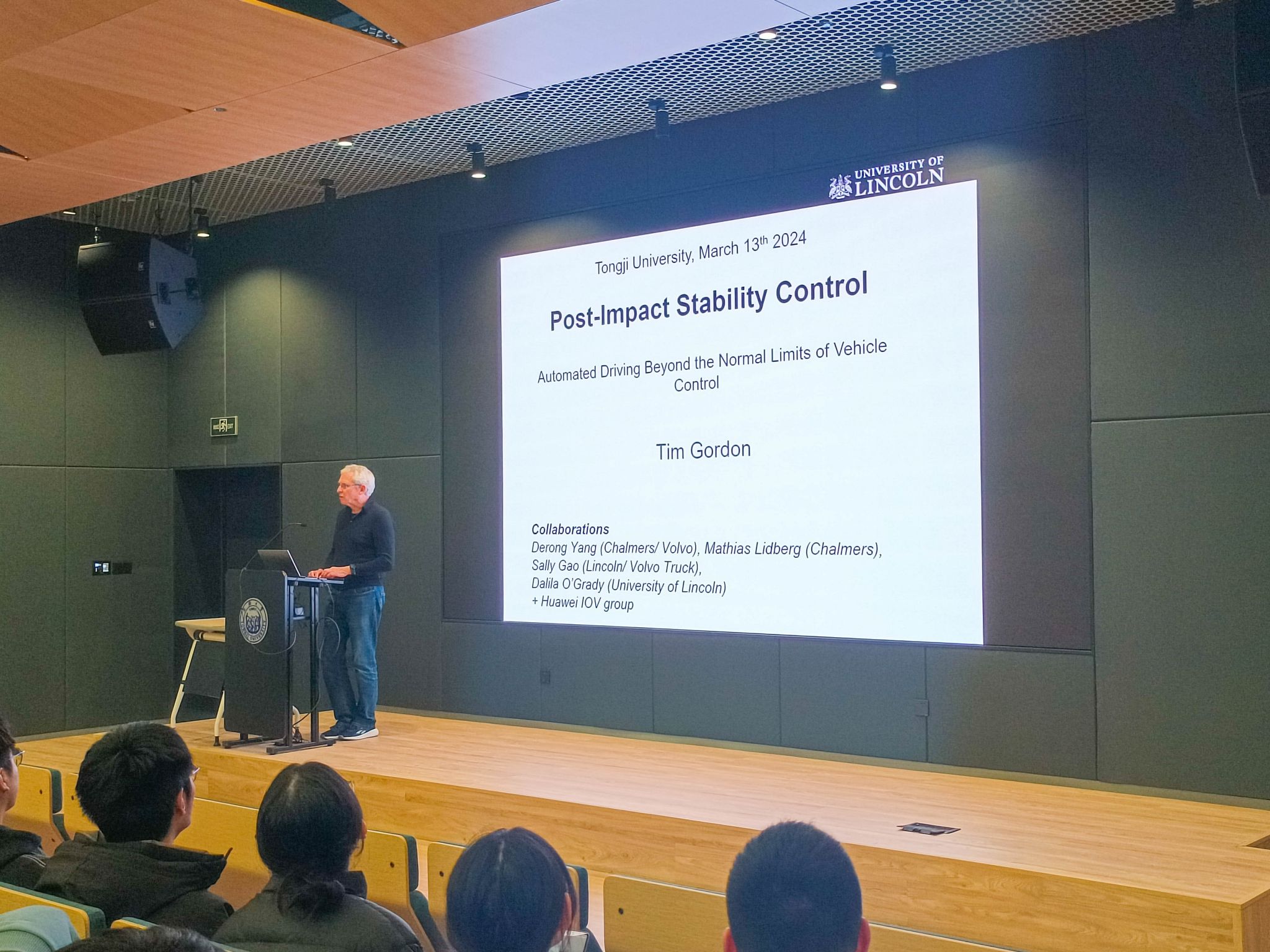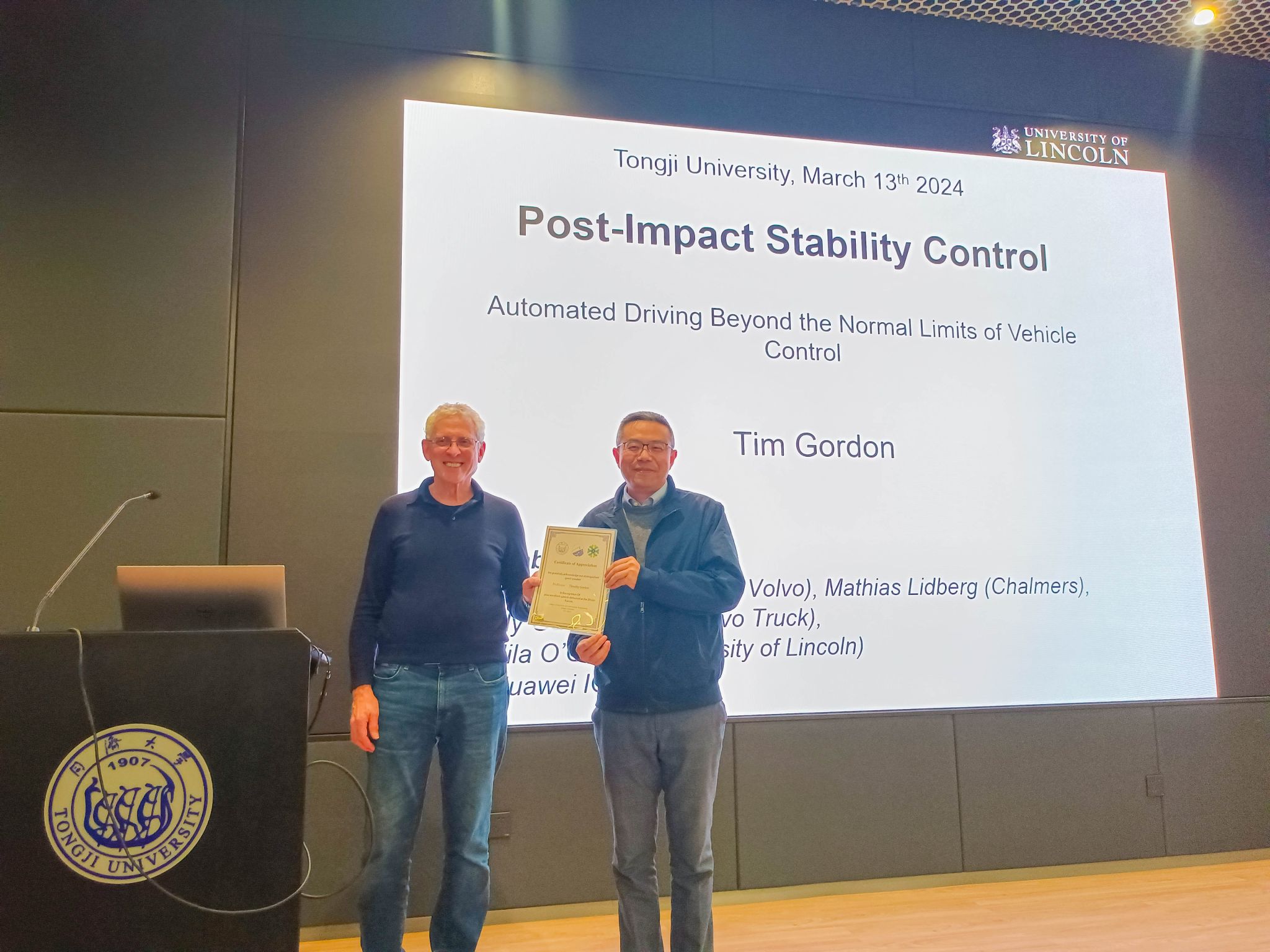 2024年3月13日下午,由学院、上海自主智能无人系统科学中心联合举办的智·信讲堂第64期在必赢官网智信馆117报告厅开讲。本次讲堂邀请英国林肯大学Timothy Gordon教授作“Post-Impact Stability Control-automated driving beyond the normal limits of vehicle control”主题报告,由陈虹教授主持。