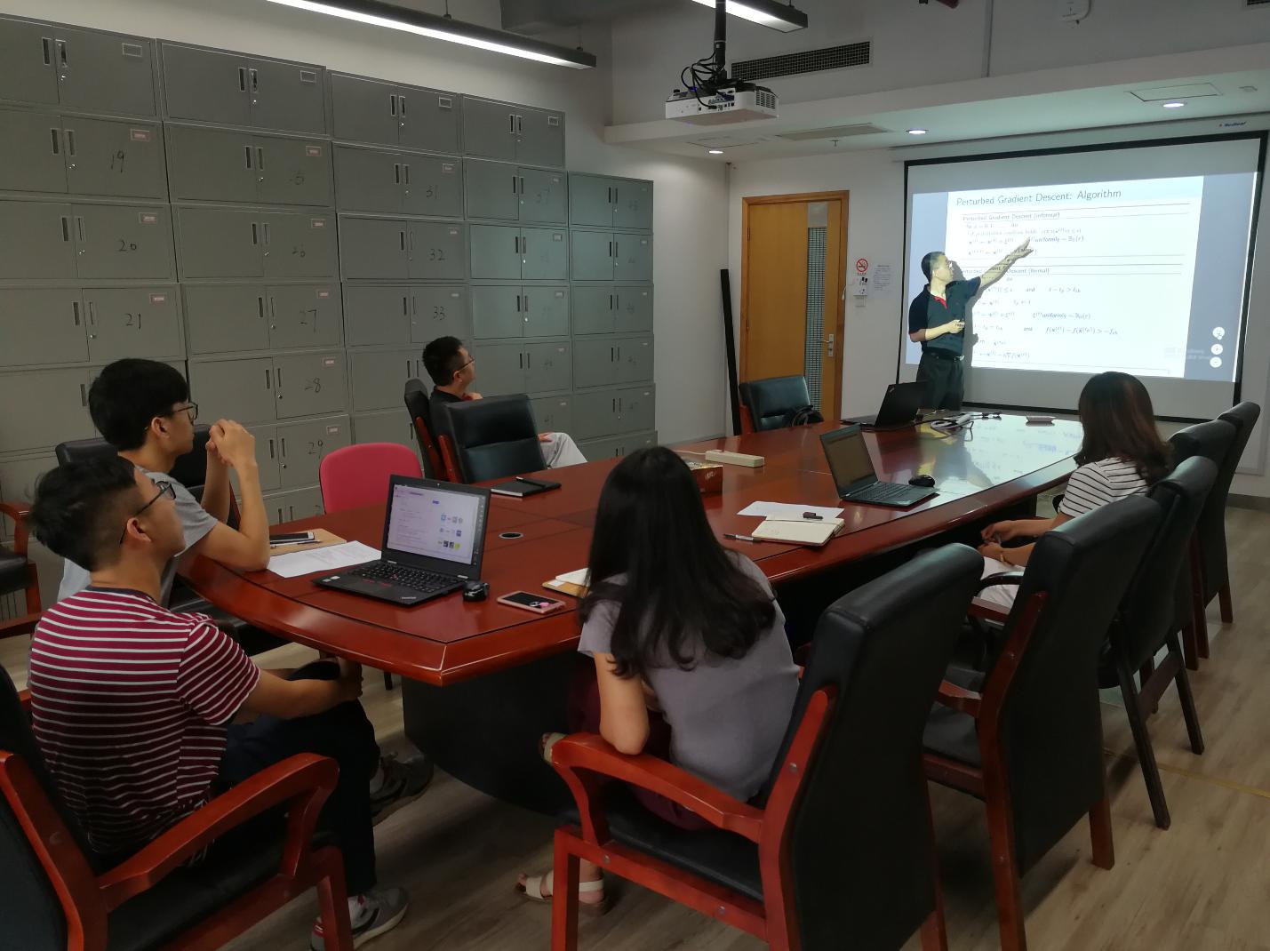 此次报告会上,Zhengdao Wang教授首先介绍了最优化理论的发展趋势、应用前景,对当前金融工程、数据统计等领域的最新进展做了介绍。然后介绍了应用场景中出现的多种光滑无约束凸优化问题,给出了其求解的一般方法,诸如Hestenes-Stiefel共轭梯度算法、WYL算法等,将该问题的学术研究现状作了详细介绍。最后,在前述内容基础上,Zhengdao Wang教授介绍了自己的最新科研成果“Perturbed Alternating Gradient DescentAlgorithm”算法,该算法基于微扰理论,采用轮询式下降梯度法使得光滑无约束凸优化问题的求解得到较优结果。Zhengdao Wang教授的报告深入浅出,理论扎实,反响热烈。报告结束后,在场师生结合各自的研究内容与Zhengdao Wang教授就微扰理论、机器学习模型等学术问题展开了热烈的讨论。