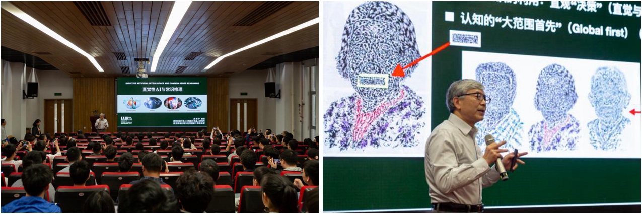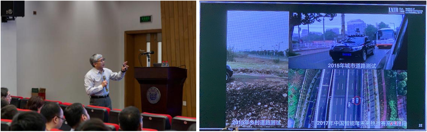 郑南宁院士主要研究的是如何让人工智能从人类智能角度的去学习、感知周围的环境信息,从而计算解决相应地的问题。郑南宁院士作了题为《直觉性AI与常识推理》的讲座。他主要从直觉性AI的计算框架、常识理解与物体属性识别、直觉推理与无人驾驶几个方面分析了新一代人工智能发展需要解决的问题及解决的方法。他首先分析了传统人工智能的局限性、卷积神经网络的局限性。提出应该构建学习与思考接近人类智能水平的机器智能。发展直觉性AI,让机器通过学习人类大脑能够将直觉和经验与以数学为基础的演绎相结合,从而以人类智能的方式完成对周围环境信息的感知与处理。然后,他讲解了物体属性-类别组合的识别推理,要利用常识和已有知识对未知事物进行推断。还提出了机器智能需要发展受心里语言启发的视觉对象常识概念学习与推理。最后,分析了实现完全自主驾驶面临的五大难题,讨论如何使机器具有直觉,从直觉性AI的角度发展无人驾驶且提出了基于认知计算引擎的无人驾驶技术,并通过实车在各个路况环境下的测试对提出技术的应用进行了效果展示。