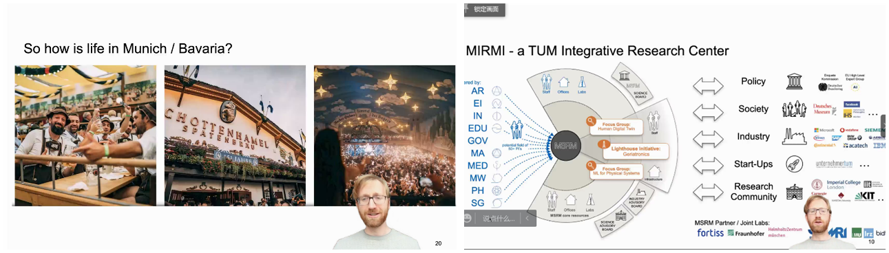 Jan Harder博士即将入职必赢官网担任中德智能科学与技术研究中心德方副主任。他在报告中介绍了德国科研资助的等级、政府关注内容、慕尼黑工业大学在机器人与人工智能方向上的实验室、研究方向、未来发展、校园文化及巴伐利亚文化。
