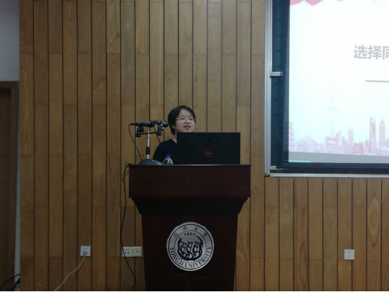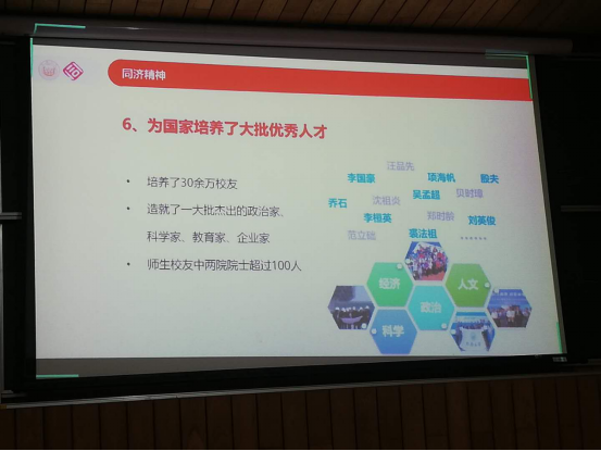 “一百一十三年栉风沐雨,同济人风雨同舟”,林秋琴老师运用生动有趣的语言讲述了同济从初创到国立、发展成综合性大学、单课性大学向综合性大学转变等几个阶段的故事,将同济的百年历史娓娓道来,讲述了同济人的感人事迹与同济的爱国精神。