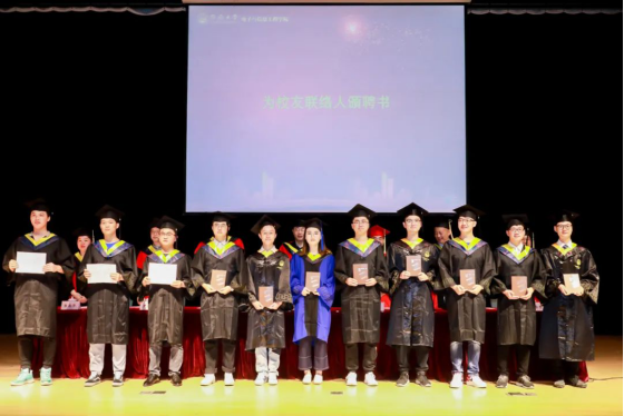 毕业典礼上,同学们为2020届“最可爱的专业教师”敬献奖杯,学院为毕业生代表颁证拨穗,表彰了荣获“上海市优秀毕业生”、“必赢线路检测中心优秀毕业生”称号的优秀电信人,校友联络人也上台接受嘉宾颁发聘书,今后各班级的同学将通过联络人使每一位毕业生仍然保持彼此之间以及和母校的联系。