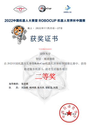 助老服务机器人比赛分为两个不同组别:助老生活服务和助老环境与安全服务,主要考察机器人的人机交互能力、机械设计能力、SLAM以及自主导航能力、机械臂自主操作能力、语音定位功能、环境状态监测等任务的完成。由控制系张志明老师指导的两支队伍顺利完成总决赛,最终双双获得全国二等奖。智信·雁浦渔歌队参加助老生活服务项目(第五名),队员为刘泳希(通信工程)、杨鸿银(电子信息工程)、张方杰(自动化)、邬致远(人工智能)、刘昊(控制科学与工程);智信·神话千里队参加助老环境与安全服务项目(第六名),队员为郭子瞻(自动化)、韩意(自动化)、张米(电气工程)。