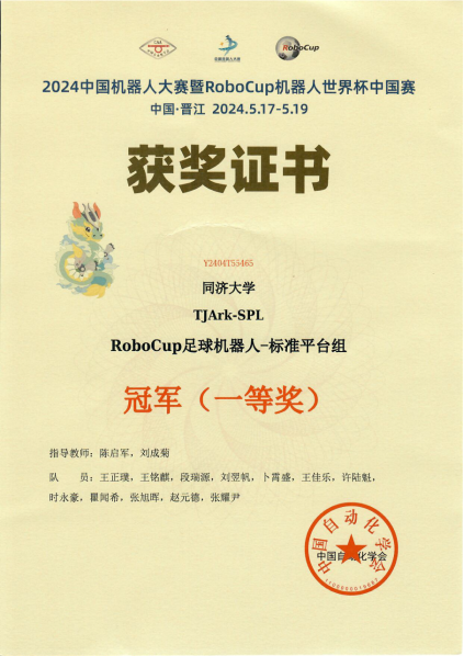 RoboCup 足球机器人-标准平台组旨在以对抗场景在统一硬件平台上检验各队伍算法与决策水平,涉及实时感知、仿生行走、多机协作等算法,是技术难度最大、关注度最高、观赏性最强的组别。该项竞赛中,TJArk是唯一实现裁判手势视觉识别的队伍,凭借稳定的底层算法、出色的团队决策,以全胜战绩获得冠军,实现该组别11连冠。