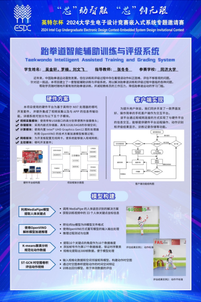 必赢官网获得一等奖的两支代表队分别是来自计算机系的本科生吴金轩、罗楠、刘文飞(指导教师:张冬冬)和来自控制系的本科生王煜程、熊祖绎、陈逸轩(指导教师:蒋磊)。吴金轩、罗楠、刘文飞小组的作品为《跆拳道智能辅助训练与评级系统》。该作品面向跆拳道训练应用,利用嵌入式系统平台进行动作视频采集,借助MediaPipe 中的预训练模型,获取了跆拳道动作训练视频中的 33 个人体关键点坐标信息,并利用ST-GCN(时空图卷积网络)提取出跆拳道动作的时空特征,作为动作的评估指标,从而进一步实现了动作评估功能。此外,团队还借助OpenVINO 工具包对模型推理过程进行了加速,充分利用了哪吒开发套件的强大 AI 计算能力。