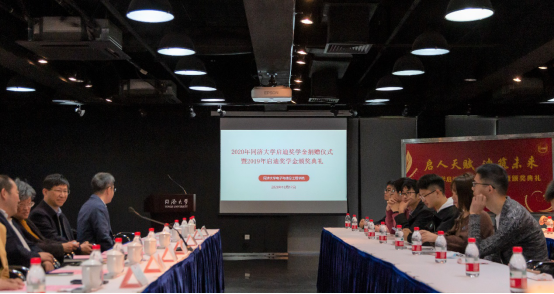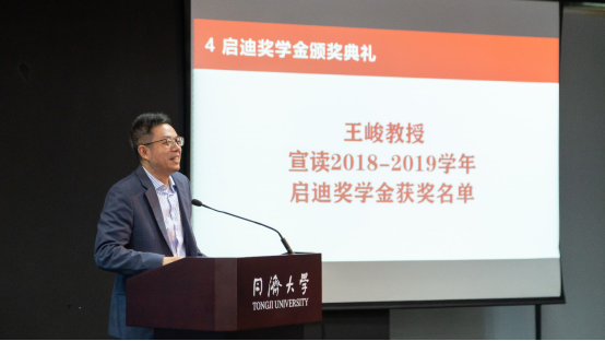 王峻教授宣读了2018-2019学年启迪奖学金获奖名单。他指出,获奖的同学均为符合吴启迪教授提出的创新能力和公益实践相结合的教育理念的优秀学生。经过层层选拔,共有9名电信学子在2019年度获得启迪奖学金荣誉。