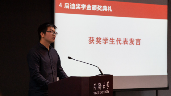 获奖学生代表项天宇同学发言,他首先表达了对吴启迪教授的敬仰与感谢,并谈到能够获得启迪奖学金,除了荣幸,更多的是一种责任,启迪奖学金除了看重同学们的专业知识,更多的看重创新实践能力,因此在获得此项荣誉后更应继续努力争取在自己的领域里干出一番成就,同时向吴教授学习,无论身处何方都秉持着同济精神,热爱祖国,奋发创新。